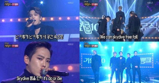 23일 오후 방송된 KBS2 '뮤직뱅크'에서는 B.A.P가 출연, 'Sky Dive' 무대를 선보였다.