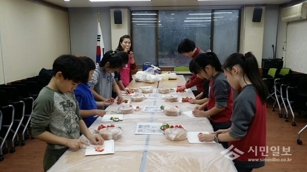 최근 경기 수원시 영통구 매탄1동 새마을 문고는 매탄1동 주민센터 2층 새마을문고에서 어린이들 10여명과 함께 크리스마스 산타케이크 특강을 진행했다. 사진은 어린이들이 케이크를 만드는 모습.(사진제공=영통구청)