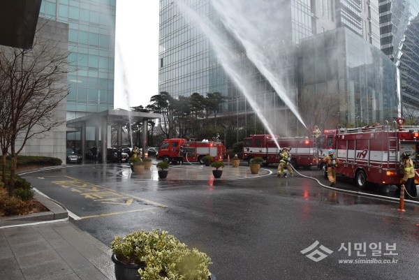 최근 서울 영등포소방서는 여의도동 소재 여의도파크센터빌딩 고층건축물 소방훈련을 실시했다. 사진은 훈련에 참여한 소방관들이 건물의 상층부에 화재가 발생한 것으로 가상해 훈련을 진행하는 모습.(사진제공=영등포소방서)