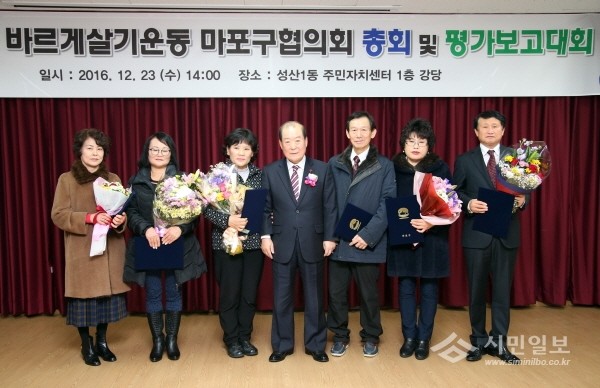 최근 박홍섭 서울 마포구청장은 성산1동 주민자치센터 1층 강당에서 열린 '2016 바르게살기운동 마포구협의회 총회 및 평가보고대회'에 참석했다. 사진은 박 구청장(가운데)이 유공 회원을 표창하고 기념촬영하고 있는 모습.(사진제공=마포구청)