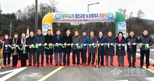 지난 23일 나진구 서울 중랑구청장(오른쪽에서 여덟 번째)이 망우동과 경기 구리시 경계에 위치한 망우리 고개의 남과 북을 연결하는 ‘망우리고개 횡단교량 준공식’에 참석해 테이프 커팅을 하고 있다.(사진제공=중랑구청)