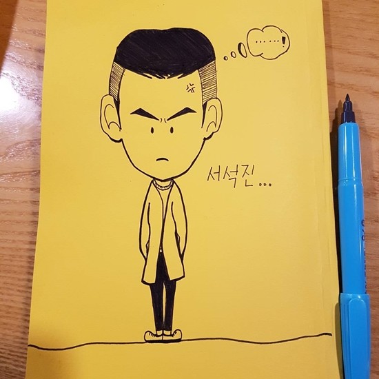 공개된 사진은 노란색 바탕인 공책에 펜으로 그린 그림으로 캐릭터 옆에 ‘서석진’이라고 적혀있다.