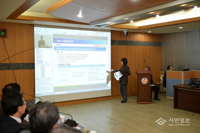 26일 이상복 인천 강화군수의 주재로 군청 영상회의실에서 30여명의 간부를 대상으로 실시된 ‘2018 올해의 관광도시 추진상황보고회’에서 변애숙 문화관광과장이 올해의 관광도시 추진상황을 보고하고 있다.(사진제공=강화군청)