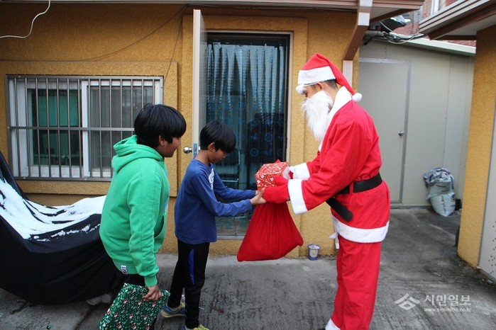 최근 경기 포천시북부희망복지센터는 사례관리 중인 23가구 43명의 아동을 대상으로 '2016 해피크리스마스' 행사를 진행했다. 사진은 산타클로스로 분장한 봉사자가 아이들에게 선물을 전달하는 모습.(사진제공=포천시청)