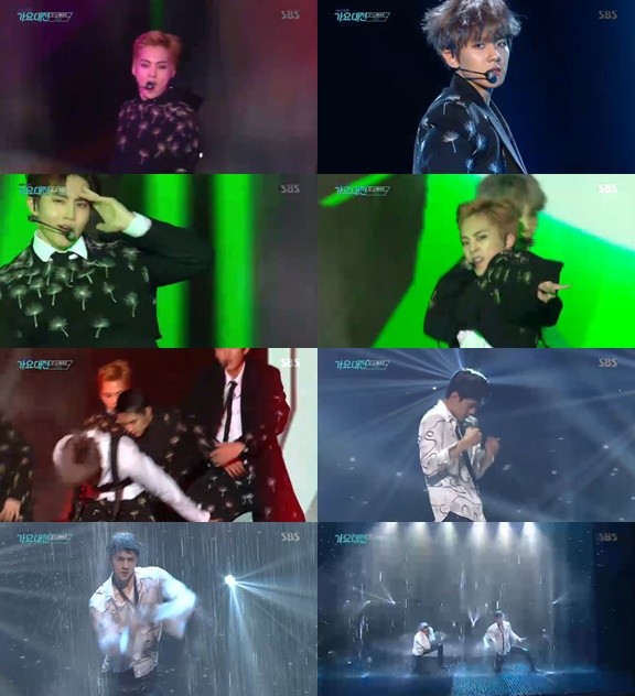 이어 멤버 카이와 세훈은 내리는 빗 속 정열의 댄스 무대로 감성적인 무대를 선보였다.