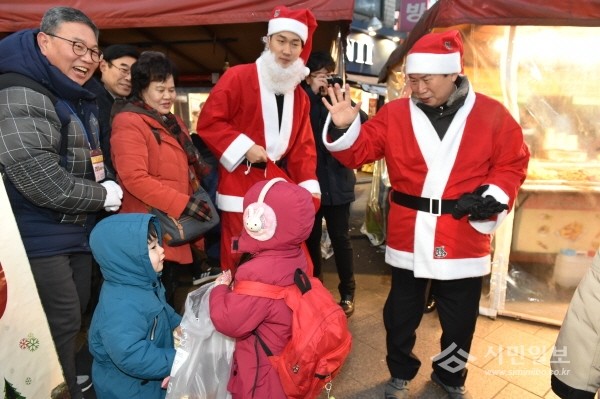 최근 나진구 서울 중랑구청장(오른쪽)이 중랑동부시장에서 실시한 ‘크리스마스 축제’에 참석해 깜짝이벤트로 산타복장을 한 후 시장을 찾은 아이들과 정답게 인사를 나누고 있다.