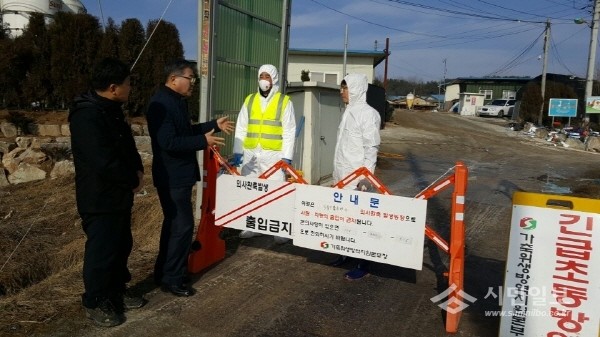 최근 원경희 경기 여주시장(왼쪽에서 두번째)은 고병원성 조류인플루엔자(AI)가 발생한 흥천면 율극리 등 살처분 현장 및 이동통제초소 4곳 등을 방문해 차단방역 상황을 점검하고 관계자들을 격려했다.(사진제공=여주시청)