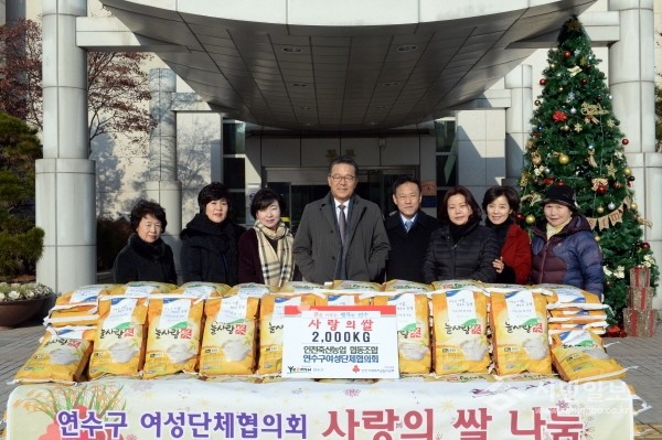 27일 인천 연수구는 인천축산농업 협동조합과 구 여성단체협의회로부터 어려운 이웃들을 위한 사랑의 쌀 200포(10kg)를 전달받았다. 사진은 이재호 구청장(왼쪽 네 번째) 및 관계자들이 기념촬영하는 모습.(사진제공=연수구청)