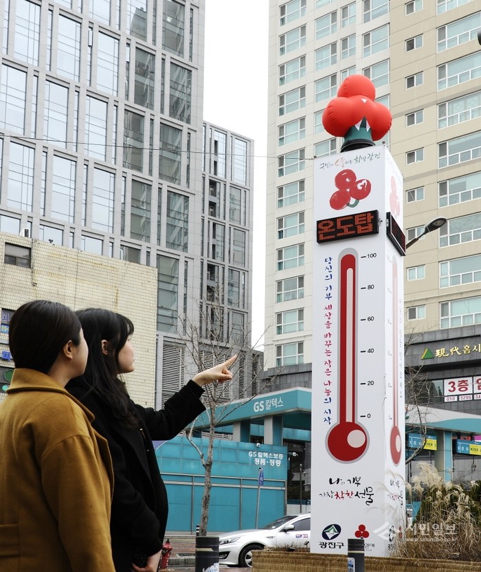 최근 서울 광진구는 연말연시를 맞아 소외된 이웃을 위해 '2017 희망온돌 따뜻한 겨울나기 사업'의 일환으로 ‘사랑의 온도탑’을 설치했다. 사진은 시민들이 사랑의 온도탑을 바라보는 모습.(사진제공=광진구청)