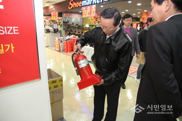 지난 27일 구로소방서는 금천구 디지털로 188 소재 W-MALL을 방문해 재해·안전사고 사전예방과 안전의식 고취를 위해 현장 안전점검을 실시했다. 사진은 장현태 서장(가운데)이 소화기를 점검하는 모습.(사진제공=구로소방서)