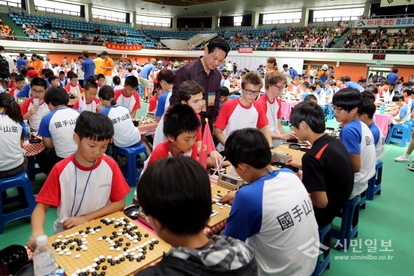 | ▲ 전동평 군수(가운데)가 바둑산업 육성을 위해 열리는 국수산맥 국제바둑대회에 참가한 바둑영재들과 이야기를 나누고 있다. | ||