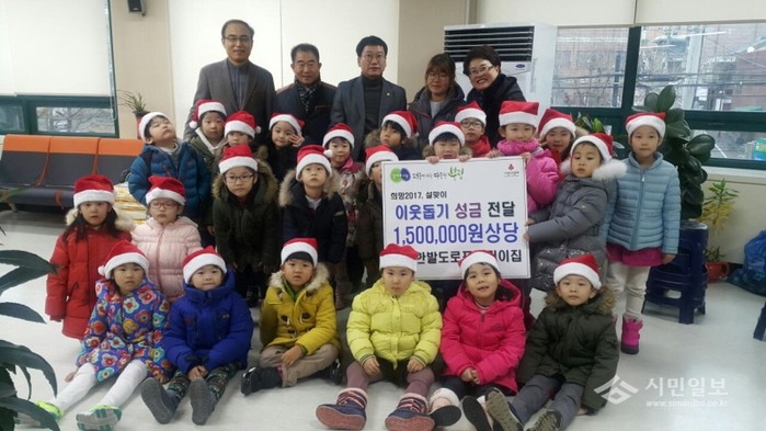 최근 인천 부평구 십정1동에 위치한 행복한 발도로프 어린이집의 7세반 어린이들이 꼬마산타로 분장하고 동주민센터를 방문해 주변 어려운 이웃을 위해 사용해 달라며 '이웃돕기 성금' 150만여원을 전달했다. 사진은 관계자들이 기념촬영하는 모습.(사진제공=부평구청)