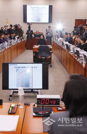조윤선 문화체육관광부 장관이 28일 오후 국회에서 열린 교육문화체육관광위원회 전체회의에서 더불어민주당 김민기 의원의 ‘문화계 블랙리스트’ 관련 질의를 듣다 화면에 표시된 블랙리스트 추정 문서를 바라보고 있다.