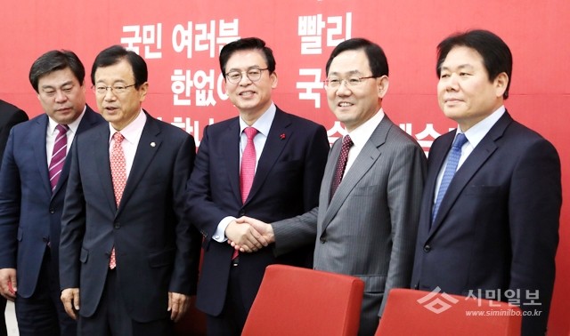 새누리당 정우택 원내대표와 개혁보수신당(가칭) 주호영 원내대표가 28일 오전 국회 원내대표실에서 만나 인사를 나누고 있다. 왼쪽부터 새누리당 김선동 원내수석부대표, 이현재 정책위의장, 정 원내대표, 개혁보수신당 주 원내대표, 정양석 원내수석부대표