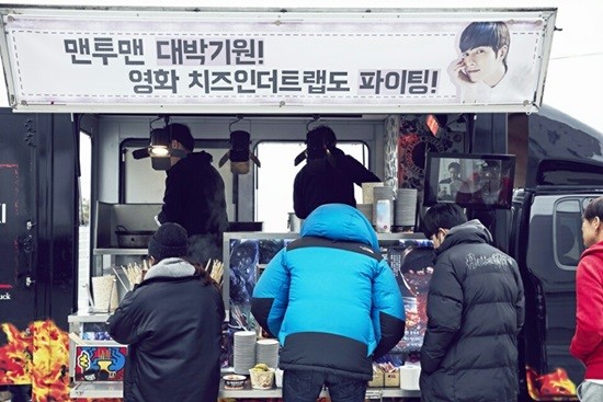 이날 간식차는 “‘맨투맨’ 대박기원, 영화 ‘치즈인더트랩’도 파이팅!!”이라는 현수막과 함께 떡볶이, 순대, 어묵, 튀김에 소시지까지 배우와 현장 스태프들을 고려한 취향 저격 간식들로 추운 날씨 속 잠시나마 여유를 선사했다.