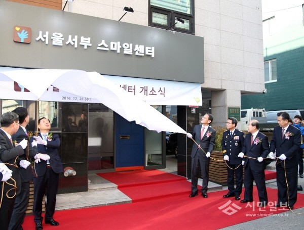 지난 28일 마포구 성산동에서 열린 '서울서부스마일센터 개소식'에서 이창재 법무부장관 직무대행(오른쪽 네번째), 김정훈 서울경찰청장(오른쪽 세번째), 박홍섭 마포구청장(오른쪽 두번째) 등 참석자들이 현판 제막을 하고 있다.(사진제공=마포구청)