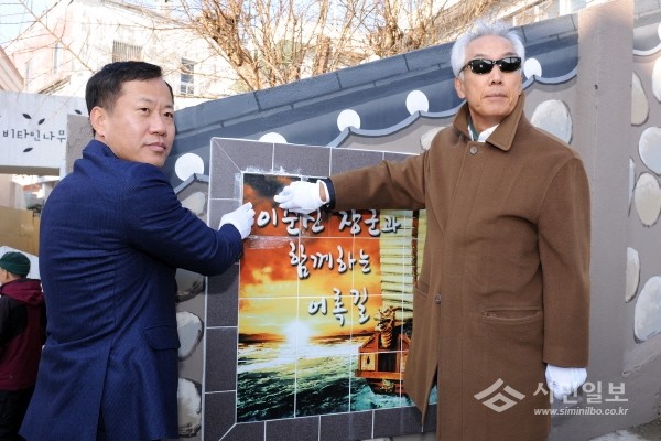 최근 전남 여수시는 진남관 주차장 앞에서 최종선 여수부시장, 지역 자생단체장 등 30여명이 참석한 가운데 '충무동 벽화거리 조성 설명회 및 타일붙이기 참여 행사'를 개최했다. 사진은 최 부시장(왼쪽)과 박용하 여수상공회의소 회장이 기념촬영을 하는 모습.(사진제공=여수시청)