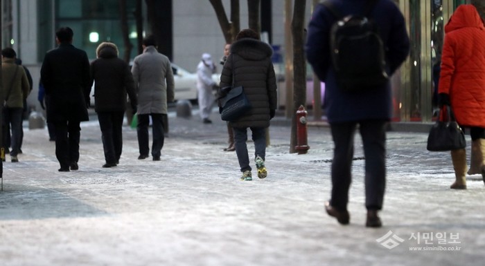 밤사이 눈이내린 29일 아침 서울 강남구에서 출근시간 시민들이 종종걸음으로 발길을 재촉하고 있다.