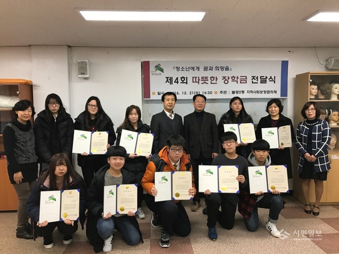 최근 서울 은평구 불광2동은 지역사회보장협의체 주관으로 동주민센터에서 지역내 중·고등학교 학생 12명에게 ‘제4회 따뜻한 장학금’을 전달했다. 사진은 장학생들과 관계자들이 기념촬영하는 모습.(사진제공=은평구청)