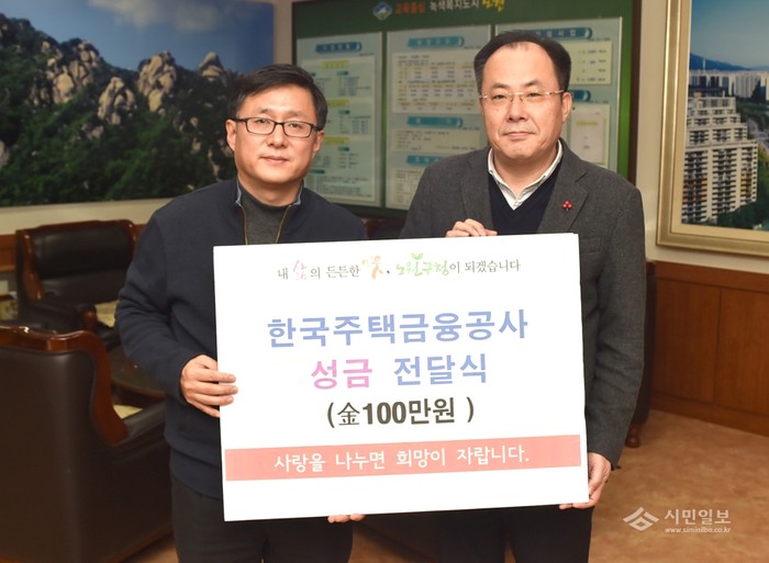 지난 28일 서울 노원구는 구청장실에서 나눔문화 확산을 위한 '한국주택금융공사 성금 전달식'을 열고 성금 100만원을 기탁받았다. 사진은 김성환 구청장(왼쪽)과 관계자가 기념촬영하는 모습.(사진제공=노원구청)