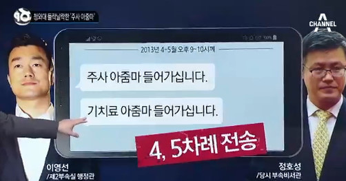 한편 2013년 4~5월 이영선 제2부속실 행정관이 정 전 비서관에 오후 9~10시께 '주사 아줌마 들어가십니다' 등의 메시지를 여러 차례 보낸 것으로 전해졌다.