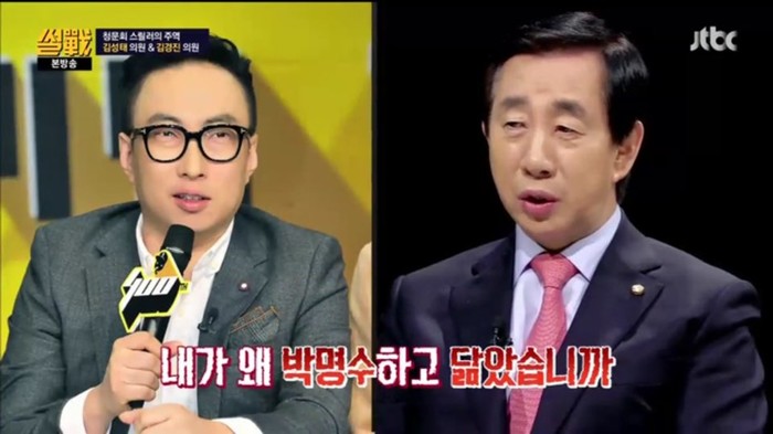 이날 김구라는 "김성태 위원장은 박영지 배우와 비슷하다"고 말을 건넸다. 김성태 위원장은 "닮은거 알고 있다"라면서 "그런데 어떤 사람들은 택도 없이 내가 박명수를 닮았다고 한다. 내가 박명수 그 친구와 어디가 닮았냐"고 버럭했다.