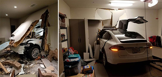 사진 속 테슬라 차량은 엔진룸이 나무벽을 뚫고 집 안으로 들어와 있어 큰 사고였음을 알게 했다.
