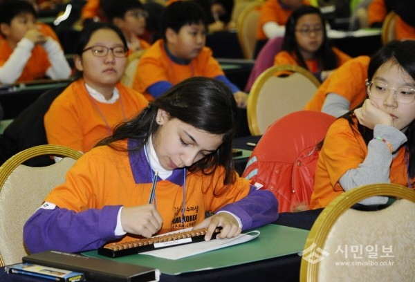 최근 광진구 세종대학교 컨벤션센터에서 '제16회 PAMA GLOBAL 세계주심산대회'가 열렸다. 사진은 이번 대회에서 주산암산 경합을 펼치는 각국 어린이 선수들의 모습.(사진제공=광진구청)