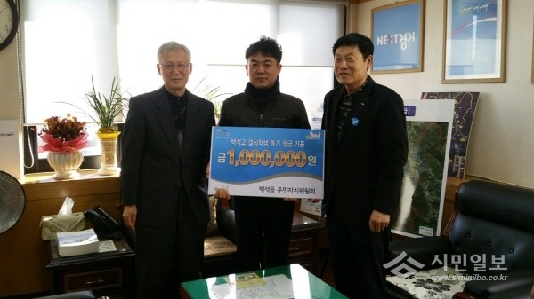 지난 2일 경기 양주시 백석읍 주민자치위원회는 백석읍 사랑방의 커피판매 수익금 100만원을 백석고 결식학생을 위해 기탁했다. 사진은 최준회 위원장 및 관계자들이 기념촬영하는 모습.(사진제공=양주시청)