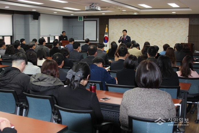 지난 2일 충남 아산교육지원청은 오전 9시 대회의실에서 김준표 교육장을 비롯한 전직원이 참석한 가운데 시무식을 열고 새해 첫 업무를 시작했다. 사진은 김 교육장이 신년사를 하는 모습.(사진제공=아산교육지원청)