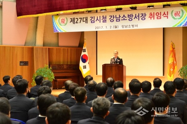 지난 2일 강남소방서는 강당에서 소방공무원 및 의용소방대원 등 120여명이 참석한 가운데 제27대 김시철 소방서장 취임식과 함께 2017년 시무식을 개최했다. 사진은 김 서장이 취임사를 하는 모습.(사진제공=강남소방서)