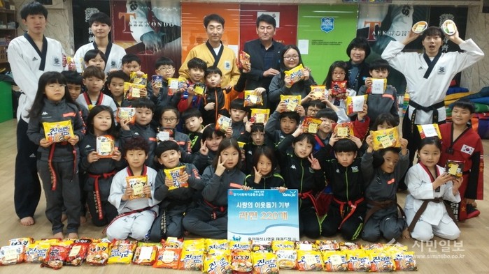 지난 3일 경기 양주시 회천2동에 위치한 '영웅태권도' 도장에 다니는 어린이들이 경기사회복지공동모금회에 라면 220개를 기부했다. 사진은 도장 관계자들과 어린이들이 기념촬영을 하는 모습.(사진제공=양주시청)