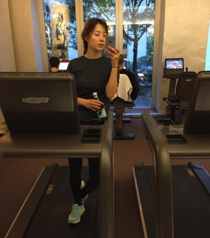 사진 속 한지혜는 헬스장에서 운동복을 입고 런닝머신을 걷고 있다.