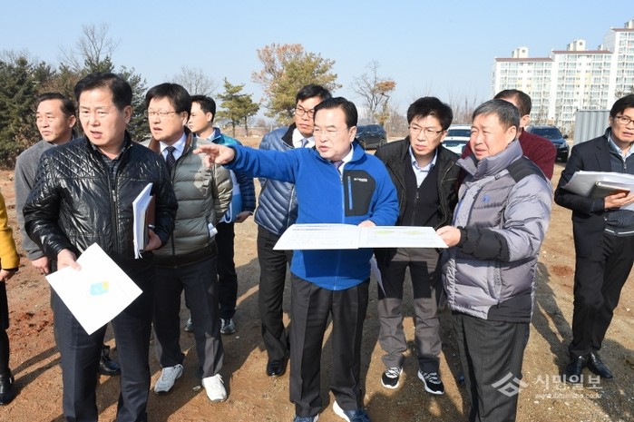 지난 4일 이성호 경기 양주시장(가운데)은 삼숭동 산84-1일원에서 추진 중인 시종합사회복지타운 부지조성 공사현장을 방문해 관련 담당자로부터 공사 진행사항을 보고받고, 문제점 검토 및 수정보완사항을 함께 의논했다.(사진제공=양주시청)