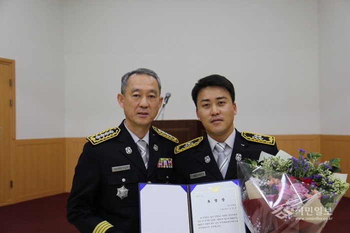경기 여주소방서는 지난 3일 대회의실에서 4분기 모범공무원에 선정된 재난안전과 공영호 소방사에 대해 '세종의 얼이 깃든 모범공무원 시상식'을 했다. 사진은 김종현 서장(왼쪽)과 공 소방사가 기념촬영을 하는 모습.(사진제공=여주소방서)