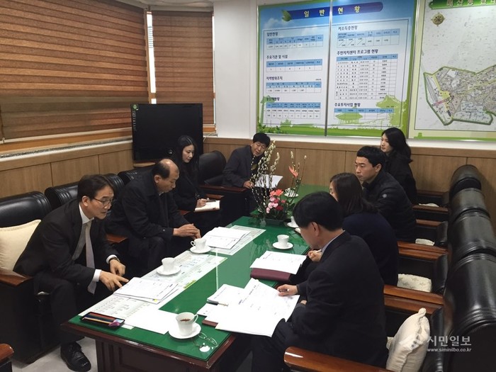 김창범 경기 수원시 팔달구청장(맨 왼쪽)은 5일 매교동, 매산동, 고등동, 화서1·2동 등 5개동 주민센터를 방문해 새해 주요 업무계획과 현안사항에 대해 청취하고 직원들을 격려했다.(사진제공=팔달구청)