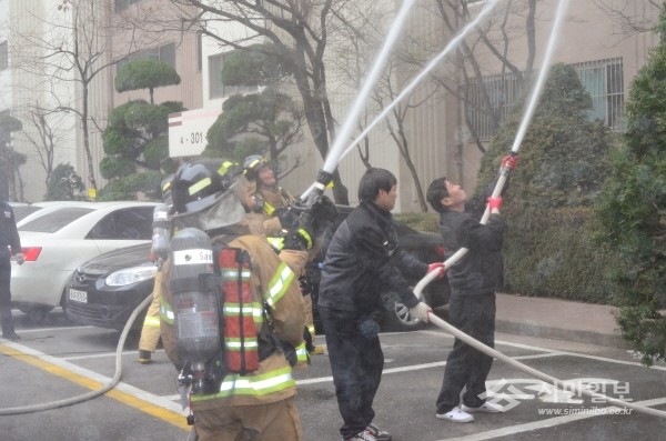 지난 5일 서울 영등포소방서는 오후 대림동(도신로) 소재 대림현대3차 아파트에서 고층건축물 합동실전 대응훈련을 실시했다. 사진은 화재가 발생한 것으로 가상해 관계자들이 화재진압 훈련을 하는 모습.(사진제공=영등포소방서)