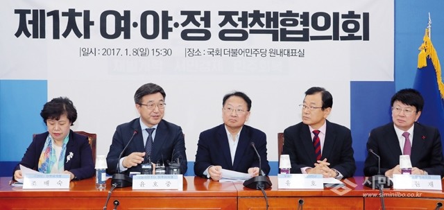 8일 오후 국회에서 열린 제1차 여ㆍ야ㆍ정 정책협의회에서 더불어민주당 윤호중 정책위의장(왼쪽에서 두 번째)이 발언하고 있다. 왼쪽부터 국민의당 조배숙 정책위의장, 더불어민주당 윤호중 정책위의장, 유일호 부총리 겸 기획재정부 장관, 새누리당 이현재 정책위의장, 바른정당 이종구 정책위의장.