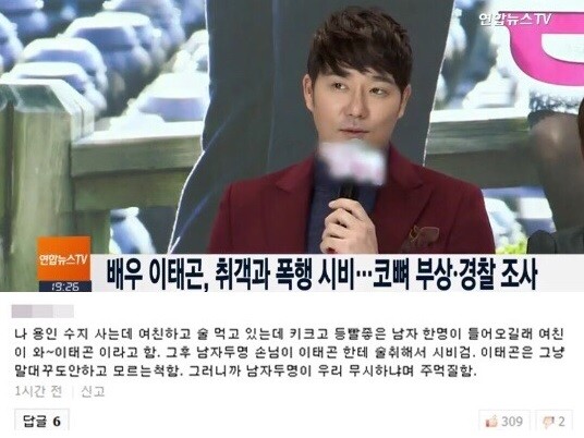 한 네티즌은 지난 7일 기사 댓글에 “나 용인 수지 사는데 여친하고 술 먹고 있는데 키 크고 등빨 좋은 남자 한명이 들어 오길래 여친이 와~이태곤 이라고 함. 그 후 남자 두 명 손님이 이태곤한테 술 취해서 시비 검. 이태곤은 그냥 말대꾸도 안하고 모르는 척 함. 그러니까 남자 두 명이 우리 무시하냐며 주먹질함”이라고 증언했다.