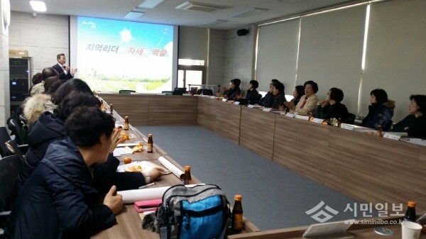 최근 경기 용인시 수지구 상현2동이 주민센터 1층 회의실에서 지역내 통장 32명을 대상으로 역량강화 교육을 실시했다. 사진은 교육에 참석한 통장들이 구청 세무과 김종억 과장의 강의를 듣고 있는 모습.(사진제공=용인시청