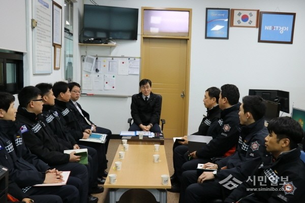 경기 하남소방서는 오는 23일까지 전 직원을 대상으로 서장과의 소통 간담회를 진행한다. 사진은 지난 9일 안기승 서장(가운데)이 신장센터 1팀 직원들과 이야기를 나누는 모습.(사진제공=하남소방서)