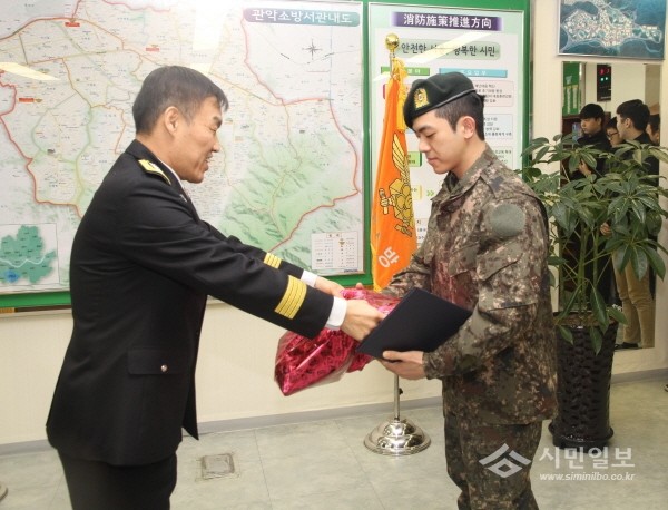 지난 9일 관악소방서는 오전 서장실에서 이강우 사회복무요원 대한 소집해제식을 가졌다. 사진은 황인환 서장이 사회복무원에게 전역증 및 기념품을 수여하는 모습.(사진제공=관악소방서)