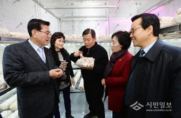 최근 열린 동대문구 청솔우성2차아파트 버섯농장 개장식에 참석한 유덕열 구청장(맨 왼쪽), 신복자 동대문구의원(오른쪽 두 번째) 등이 지하주차장에 조성된 버섯농장에서 자라고 있는 송이버섯을 구경하고 있다.(사진제공=동대문구청)