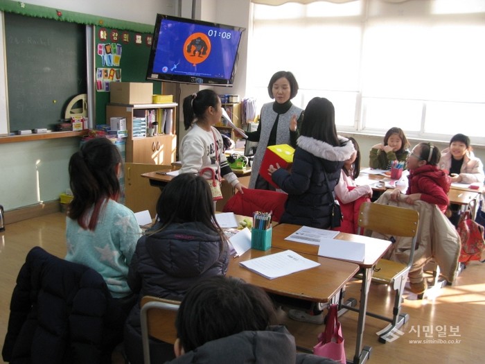 경기 부천심곡초등학교는 3~5학년 학생을 대상으로 오는 20일까지 2주 동안 '겨울방학 영어캠프'를 실시한다. 사진은 지난 9일 영어캠프에 참여한 학생들이 교사에게 수업을 듣는 모습.(사진제공=부천교육지원청)