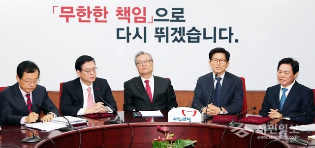 새누리당 김문수 전 경기지사(오른쪽에서 두 번째)가 10일 오전 서울 여의도 당사에서 열린 비상대책위원 및 주요당직자회의에서 비대위원 임명장을 받은 뒤 인사말을 하고 있다. 왼쪽부터 이현재 정책위의장, 정우택 원내대표, 인명진 비대위원장, 김 전 지사, 박완수 의원.