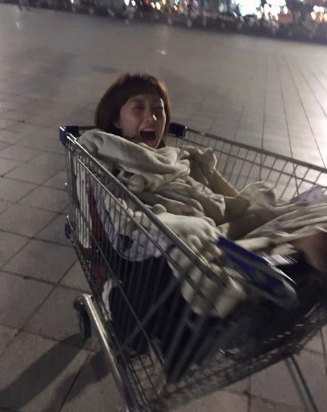 공개된 사진 속 그는 마트의 카트안에 탄 채로 담요를 덮고 있으며 활짝 웃고 있는 모습이다.