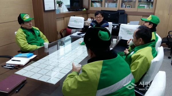 11일 경기 수원시 영통구 매탄1동은 청소담당 직원 및 환경관리원이 참여한 가운데 새해 첫 간담회를 실시했다. 사진은 참여자들이 환경관리원 대기실 환경 개선에 대해 의견을 나누는 모습.(사진제공=영통구청)