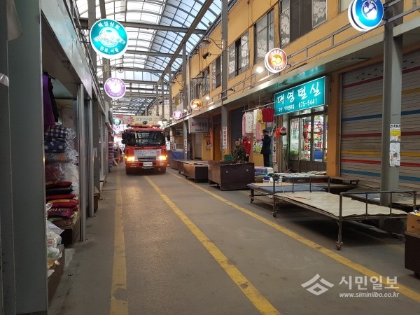 경기 안성소방서는 11일 오전 10시부터 전통시장의 초기대응 시스템 구축과 자위소방능력 제고를 위해 안성시장에서 현장대응훈련을 실시했다. 사진은 소방통로 확보훈련을 진행 중인 모습.(사진제공=안성소방서)