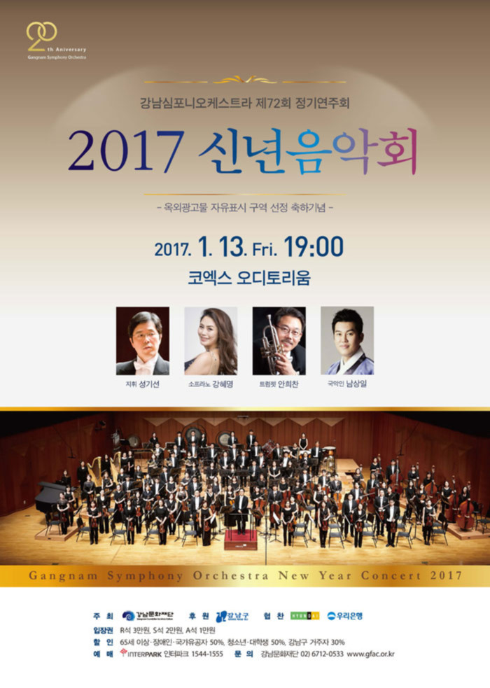 구 관계자는 “옥외광고물 자유표시구역으로 지정돼 한국판 타임스 스퀘어로 자리잡을 코엑스에서 신년음악회를 개최함으로써 음악이 흐르는 예술과 문화가 어우러진 명실상부 세계적 관광명소 코엑스를 기대한다”며 “신년음악회에 많은 분이 사랑하는 가족·친구·연인과 참석해 새로운 한 해를 아름다운 선율로 희망차게 시작하길 바란다”고 말했다.