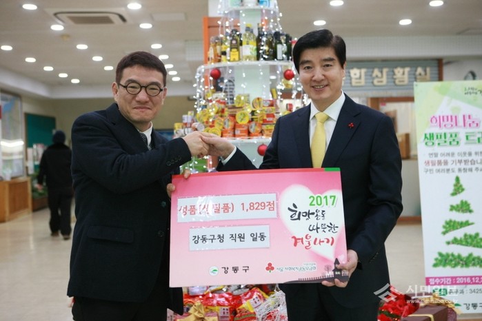 지난 10일 서울 강동구 구청직원들에게 기부받은 생필품 등으로 본관 1층 로비에 꾸며진 나눔트리 '희망의 생필품 트리' 앞에서 이해식 구청장(오른쪽)이 총 1829점의 기부물품을 임정백 강동종합사회복지관장에게 전달하고 있다.(사진제공=강동구청)
